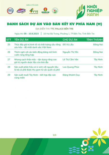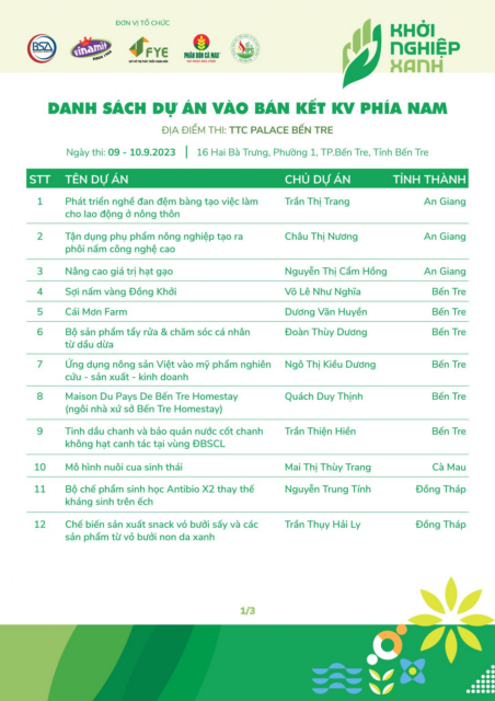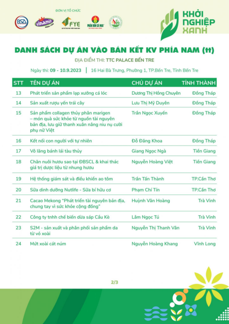 Dưới đây là 29 Dự án vào vòng bán kết thi tại Bến Tre :