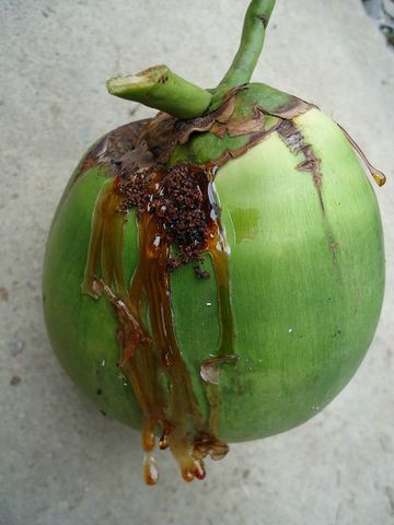 Triệu chứng bọ vòi voi gây hại trên trái dừa