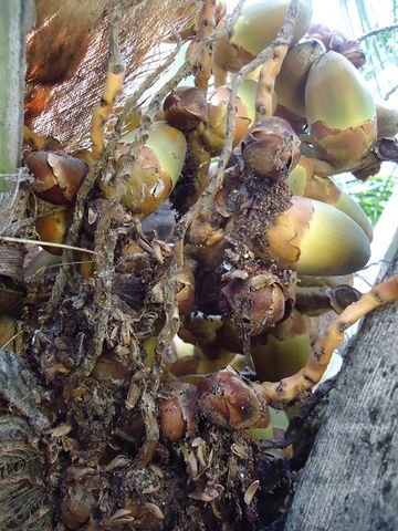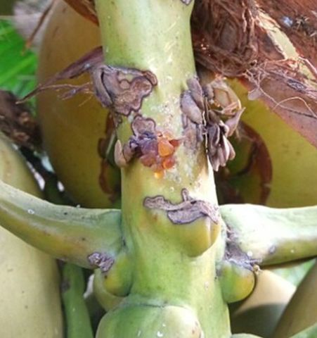 + Bọ vòi voi: rất phổ biến trên các vườn dừa. Bọ vòi voi gây hại chủ yếu trên trái, còn trên rễ và cuống hoa ít được phát hiện. Triệu chứng gây hại cơ bản là chảy nhựa ở cả rễ, thân, bẹ lá, cuống hoa và trái. Ấu trùng bọ vòi voi mới nở đục vào mô cây nơi trứng được đẻ gây ra hiện tượng chảy nhựa.