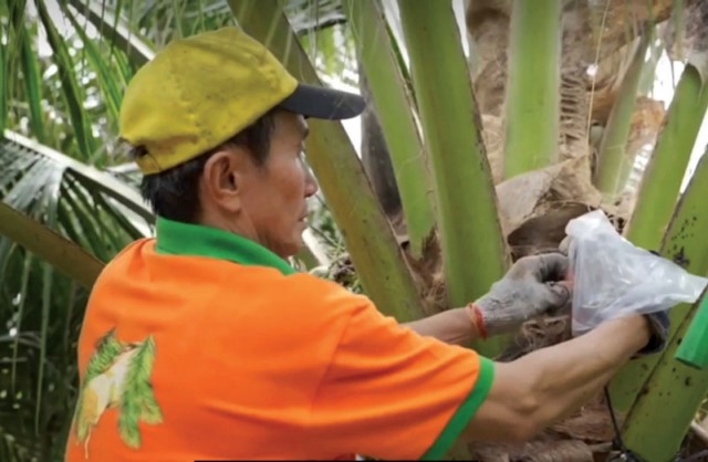Khai thác mật hoa dừa xiêm. Ảnh: do nhân vật cung cấp