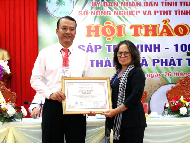Lãnh đạo Hiệp hội Dừa Việt Nam trao công nhận "Cây dừa được trồng tại Trà Vinh là cây dừa Việt Nam" cho tỉnh Trà Vinh. Ảnh: Hồ Thảo.