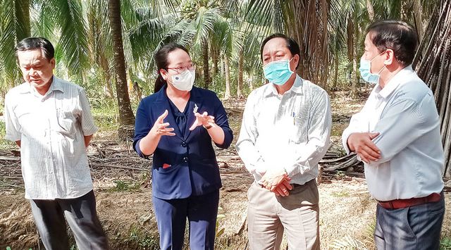BDK.VN - Ngày 25-2-2021, Bí thư Huyện ủy Mỏ Cày Nam Nguyễn Thị Hồng Nhung đã đến kiểm tra thực tế tình hình sâu đầu đen gây hại trên diện tích vườn dừa hữu cơ của xã Tân Trung. Cùng đi có Phó chủ tịch UBND huyện Đỗ Hoàng Minh.