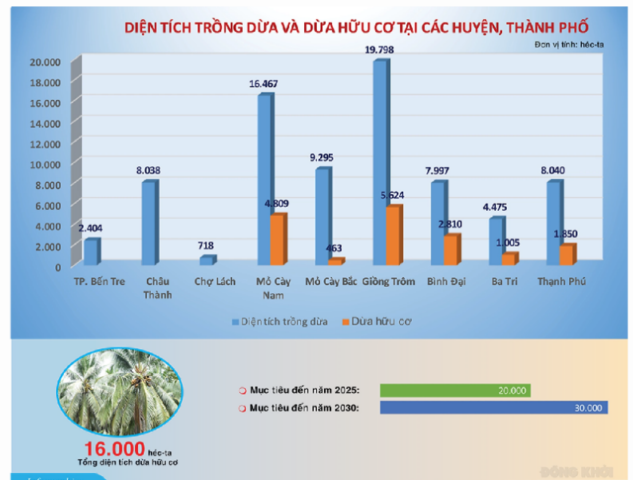 Bến Tre là thủ phủ dừa của cả nước với diện tích hơn 78.000 ha, sản lượng sản lượng thu hoạch 6 tháng đầu năm khoảng 352 triệu trái dừa đạt khoảng 688.000 tấn. Trong đó, diện tích dừa tham gia chuỗi giá trị của tỉnh Bến Tre trên 23.700ha, chiếm trên 30% tổng diện tích dừa của tỉnh, sản lượng dừa tham gia chuỗi giá trị đạt trên 230.000 tấn/tổng sản lượng dừa của toàn tỉnh. Tổng diện tích dừa hữu cơ trên 18.000ha và diện tích đạt chứng nhận 11.630ha theo tiêu chuẩn Mỹ, Nhật và EU.