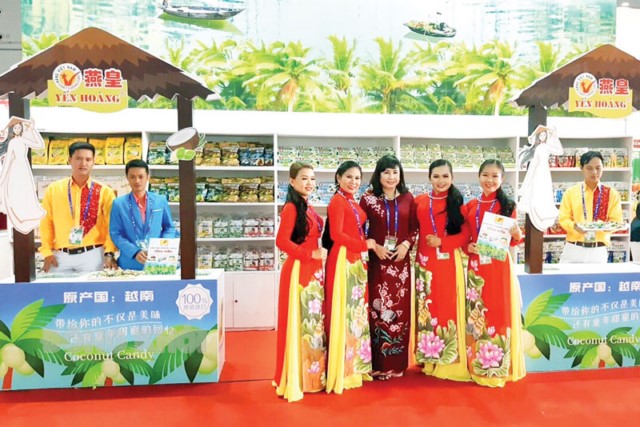 Sản phẩm kẹo dừa của Công ty TNHH Vĩnh Tiến được chọn trưng bày đại diện cho sản phẩm quốc gia tại Hội chợ ASEAN - Trung Quốc. Ảnh: Thạch Thảo