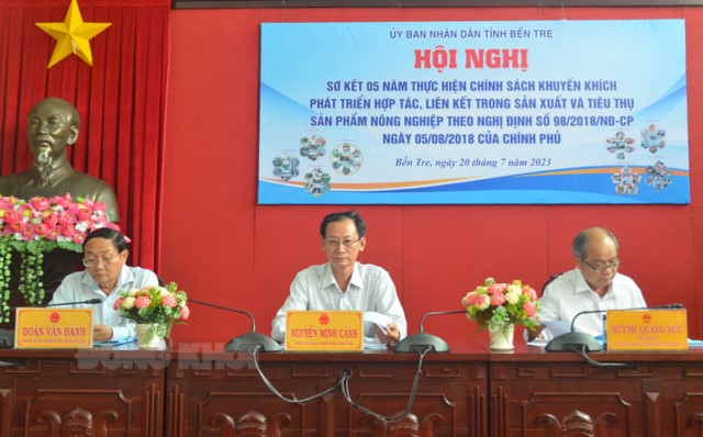 BDK.VN - Ngày 20-7-2023, Phó chủ tịch UBND tỉnh Nguyễn Minh Cảnh, Giám đốc Sở Nông nghiệp và phát triển nông thôn Đoàn Văn Đảnh, Phó giám đốc Sở Nông nghiệp và phát triển nông thôn Huỳnh Quang Đức chủ trì hội nghị sơ kết 5 năm thực hiện chính sách khuyến khích phát triển hợp tác, liên kết trong sản xuất và tiêu thụ sản phẩm nông nghiệp theo Nghị định số 98/2018/NĐ-CP ngày 5-8-2018 của Chính phủ.
