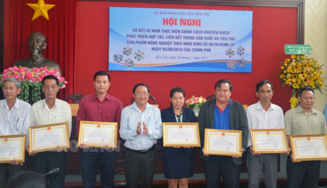 Trên cơ sở Nghị định số 98/2018/NĐ-CP của Chính phủ về chính sách khuyến khích phát triển hợp tác, liên kết trong sản xuất và tiêu thụ sản phẩm nông nghiệp (gọi tắt là Nghị định số 98/2018/NĐ-CP), HĐND tỉnh, Tỉnh ủy, UBND tỉnh đã ban hành nghị quyết (NQ), kế hoạch về xây dựng và hoàn thiện chuỗi giá trị sản phẩm nông nghiệp chủ lực tỉnh giai đoạn 2016 - 2020 và định hướng đến năm 2025. Đến nay, toàn tỉnh có 67 tổ hợp tác (THT), 68 hợp tác xã (HTX) tham gia vào chuỗi giá trị các sản phẩm nông nghiệp chủ lực. Trên địa bàn tỉnh đã hình thành vùng sản xuất dừa tập trung gắn với chuỗi giá trị dừa; vùng sản xuất cây ăn trái đặc sản (bưởi da xanh, chôm chôm, nhãn, xoài, sầu riêng, heo, bò, tôm và chuỗi cây giống - hoa kiểng).