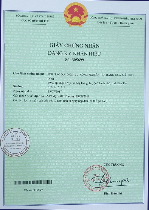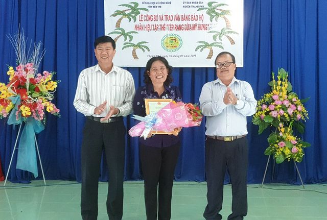 Thời gian qua, để nâng cao hiệu quả sản xuất, mở rộng thị trường và tăng khả năng cạnh tranh cho sản phẩm, huyện đã chỉ đạo cho các ngành phối hợp với HTX và sự hỗ trợ của Sở KH&CN lập hồ sơ đề nghị công nhận nhãn hiệu tập thể “Tép rang dừa Mỹ Hưng”. Qua thời gian xem xét, đến ngày 19/9/2018, Cục Sở hữu trí tuệ - Bộ KH&CN đã có Quyết định số 65190 về việc cấp Giấy chứng nhận đăng ký nhãn hiệu số 305699 cho HTX dịch vụ nông nghiệp Tép rang dừa Mỹ Hưng. Địa chỉ 69/2, ấp Thạnh Mỹ, xã Mỹ Hưng, huyện Thạnh Phú. Thời hạn sử dụng 10 năm, sau đó đăng ký tái công nhận nhãn hiệu.