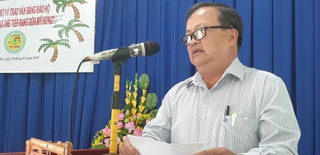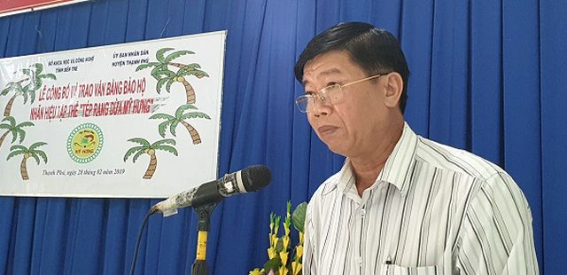 Sáng 28/02, tại xã Mỹ Hưng, Sở Khoa học và Công nghệ (KH&CN) Bến Tre phối hợp với UBND huyện Thạnh Phú tổ chức lễ công cố và trao văn bằng bảo hộ nhãn hiệu tập thể “Tép rang dừa Mỹ Hưng”. Ông Nguyễn Văn Vưng, Phó Giám đốc Sở KH&CN, ông Nguyễn Ngọc Tân, Phó Chủ tịch UBND huyện đến dự.