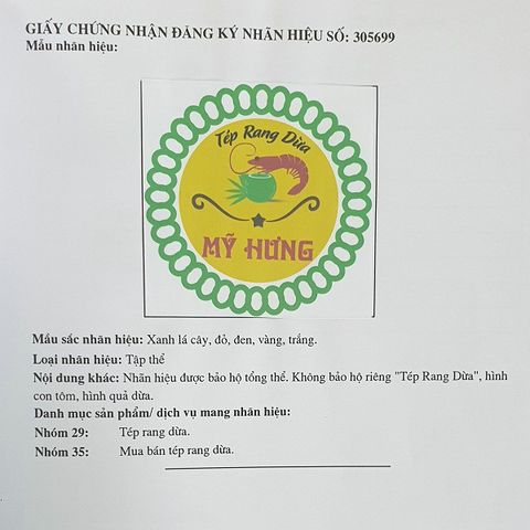 Giấy chứng nhận đăng ký nhãn hiệu Tép rang dừa Mỹ Hưng.