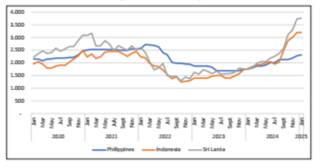 Năm 2024, giá dừa nạo sấy có xu hướng tăng đáng kể ở cả ba nước sản xuất chính, tương quan với sự thay đổi trong cung và cầu toàn cầu. Philippines mức tăng ổn định từ 1.764 đô la Mỹ/tấn vào tháng 1 lên 2.315 đô la Mỹ/tấn vào tháng 12. Giá của Indonesia tăng mạnh hơn, từ 1.771 đô la Mỹ/tấn vào tháng 1 lên 3.200 đô la Mỹ/tấn vào cuối năm. Sri Lanka cũng có diễn biến tương tự, với giá tăng từ 1.750 đô la Mỹ/tấn vào tháng 1 lên 3.760 đô la Mỹ/tấn vào tháng 12. Sự gia tăng mạnh này cho thấy nhu cầu tăng cao, tiềm ẩn hạn chế về nguồn cung và chi phí sản xuất tăng. Ngược lại, năm 2023 được đặc trưng bởi sự ổn định giá tương đối, chỉ có những biến động nhỏ. Philippines duy trì giá trong khoảng 1.690-1.874 đô la Mỹ/tấn, với mức giảm nhẹ vào giữa năm trước khi phục hồi. Indonesia chứng kiến mức tăng dần từ 1.400 đô la Mỹ/tấn vào đầu năm 2023 lên 1.720 đô la Mỹ/tấn vào tháng 12 , trong khi Sri Lanka Giá dao động từ 1.552 USD/tấn vào tháng 7 đến 1.788 USD/tấn vào tháng 11. Sự tương phản giữa hai năm làm nổi bật sự thay đổi trong diễn biến thị trường, trong đó tốc độ tăng trưởng vào năm 2024 cho thấy sự gián đoạn chuỗi cung ứng, chi phí đầu vào tăng hoặc nhu cầu quốc tế tăng, đặc biệt ảnh hưởng đến Indonesia và Sri Lanka.