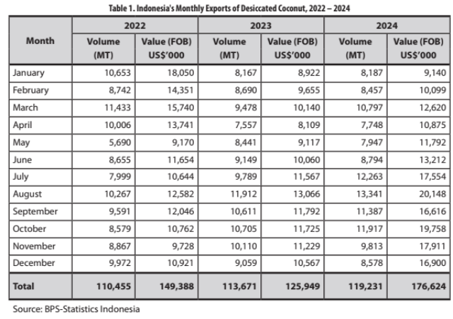 Indonesia, một trong những nước xuất khẩu cơm dừa nạo sấy lớn nhất thế giới, đã cho thấy xu hướng biến động trong xuất khẩu trong 5 năm qua. Năm 2024, khối lượng xuất khẩu đạt 119.231 tấn, cho thấy phục hồi nhẹ so với mức 113.671 tấn năm 2023 nhưng vẫn thấp hơn mức đỉnh điểm năm 2021 là 139.932 tấn. Điều thú vị là giá trị xuất khẩu năm 2024 tăng vọt lên 176,62 triệu đô la, cao hơn đáng kể so với mức 125,96 triệu đô la năm 2023, cho thấy giá cao hơn đã giúp bù đắp cho giảm về khối lượng. Sự sụt giảm cả về khối lượng và giá trị vào năm 2022 phù hợp với sự suy thoái toàn cầu, nhưng sự phục hồi vào năm 2024 về giá trị xuất khẩu có thể cho thấy sức mạnh định giá mạnh hơn hoặc nhu cầu tăng từ các thị trường thay thế bên ngoài Hoa Kỳ và EU. Các nhà xuất khẩu Indonesia có thể cần tiếp tục đa dạng hóa phạm vi thị trường của họ và cải thiện hiệu quả sản xuất để điều hướng những bất ổn trong nhu cầu toàn cầu.