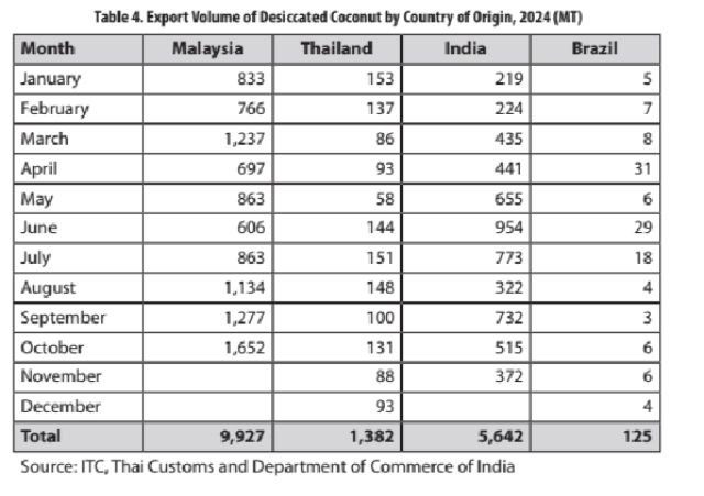 Khi giá tăng, tổng giá trị nhập khẩu tăng 2,7%, đạt 498,1 triệu đô la Mỹ trong tháng 1-10 năm 2024. Bất chấp sự gia tăng này, thị trường toàn cầu đối với dừa sấy khô đã giảm 5,9% về khối lượng nhập khẩu, giảm từ 322.445 tấn (tấn) trong tháng 1-10 năm 2023 xuống còn 303.313 tấn trong cùng kỳ năm 2024. Điều này do hạn chế về nguồn cung, chi phí sản xuất cao hơn hoặc thay đổi trong mô hình thương mại. Giảm chung về khối lượng toàn cầu có thể là do các yếu tố như nguồn cung giảm từ các nước sản xuất chính, cạnh tranh gia tăng từ các sản phẩm thay thế hoặc nhu cầu tiêu dùng thay đổi ở một số khu vực nhất định. Tuy nhiên, sự tăng trưởng về giá trị mặc dù khối lượng thấp hơn cho thấy nhu cầu vẫn mạnh ở một số thị trường chính, duy trì giá cao hơn.