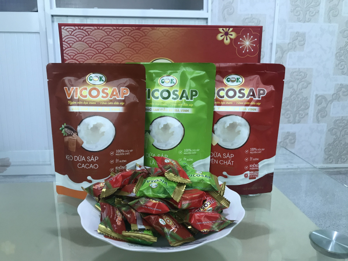 Sản phẩm kẹo dừa sáp và dừa sáp sợi của Công ty TNHH Chế biến dừa sáp Cầu Kè (VICOSAP) vừa được UBND tỉnh Trà Vinh phê duyệt sản phẩm tiềm năng nâng cấp lên 5 sao. Ảnh: Minh Đảm.