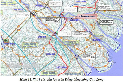 Vị trí cầu Đình Khao (tại báo cáo nghiên cứu tiền khả thi) trên bản đồ các cầu lớn thuộc đồng bằng sông Cửu Long.